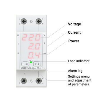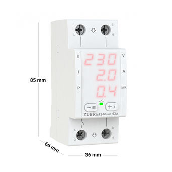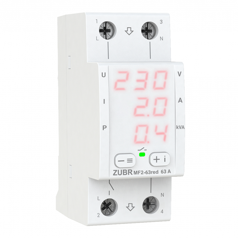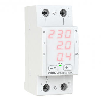 The ZUBR MF2 red multifunction relay has a compact 2 module wide housing. Thanks to three digital screens, simultaneously displays the value of voltage, current and power, which is very convenient when monitoring all parameters at the same time. In standby mode it is possible to adjust the brightness of the screen. The ZUBR MF2 red relay has a wide functionality that combines: ZUBR CV2 functions, current and power control ZUBR MF, as well as the possibility of advanced settings of current limits.
