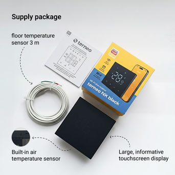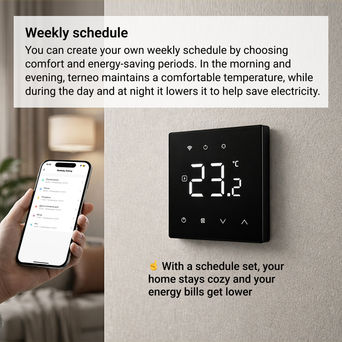 terneo nx black is a Wi-Fi thermostat for controlling underfloor heating from your smartphone via the Tuya app. It allows you to use smart automation features such as smart home scenarios, control the temperature, set schedules, automate heating, and optimize energy consumption.