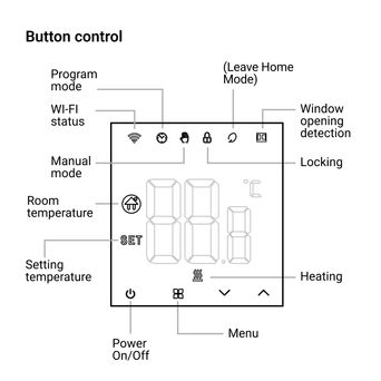 The thermostat connects to Wi-Fi and is controlled via the Tuya or Smart Life mobile app.