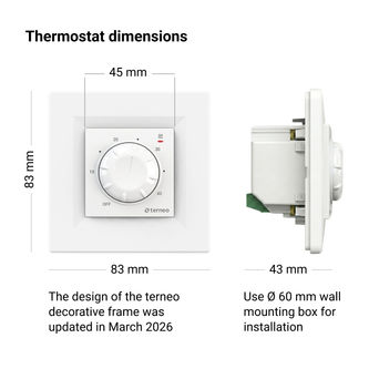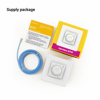 The package includes the thermostat itself, a temperature sensor with a connecting wire of 3m length and a decorative frame. The thermostat is mounted in a standard 60 mm diameter sub-socket.