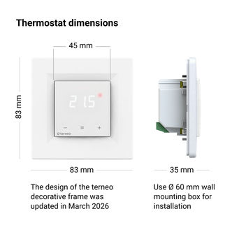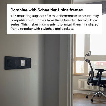 Усі терморегулятори terneo для установлення в монтажну коробку сумісні з оригінальною рамкою terneo та рамками Schneider-Electric серії Unica Basic, Unica Colors, Unica Quadro, Unica Plus, Unica Top, Unica Class, Unica New. Терморегулятори terneo s та terneo s unic однакові та відрізняються лише декоративною рамкою. terneo s комплектується оригінальною рамкою terneo, terneo s unic — рамкою Schneider-Electric серії Unica Basic.