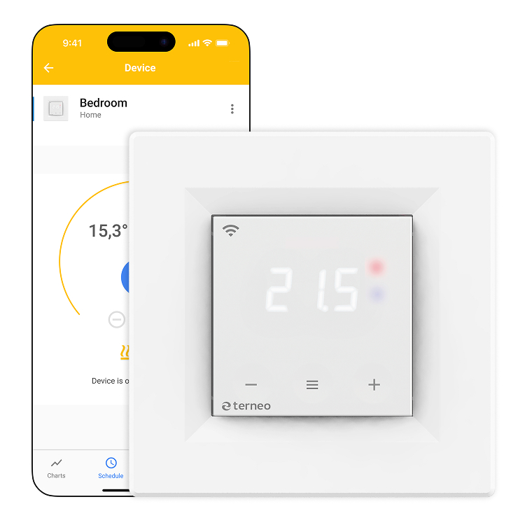 Smart Wi-Fi thermostat with Geofencing for maximum savings is used for heating floor. Control from terneo app in a smartphone or my.terneo from anywhere in the world.