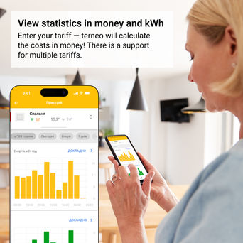 Use the terneo app or voice through Google Home to control heating from anywhere. To work with statistics on a group of thermostats, it is convenient to use my.terneo.ua PC application. Get instant access to your home temperature, heating dynamics, and energy reports in kWh and money.